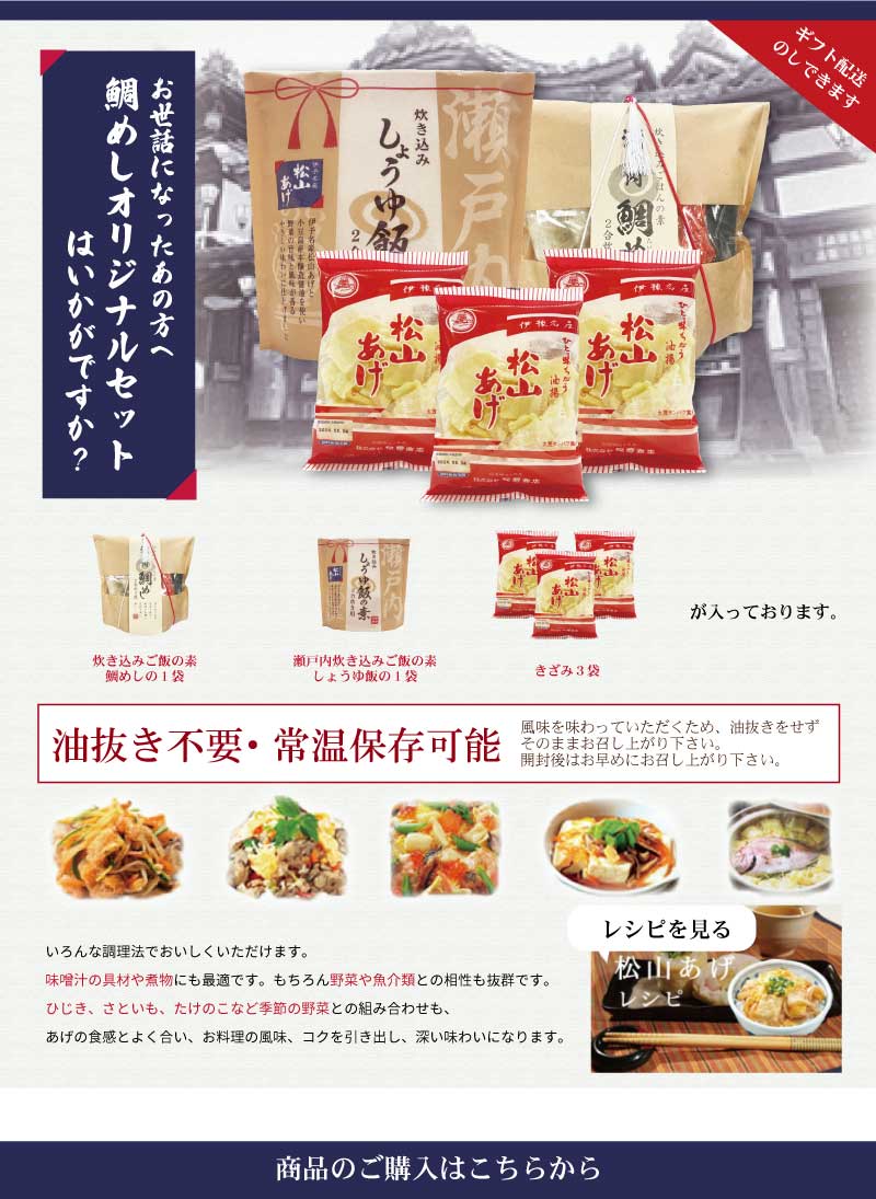TOP商品一覧 鯛めしオリジナルセット 鯛めしオリジナルセット 価格: ¥3,050 (税込) [ポイント還元 30ポイント~] 販売期間: 数量: 個 在庫: 在庫あり 在庫 在庫あり 返品についての詳細はこちら 【内容量】鯛めし(1袋)、しょうゆ飯(1袋)、きざみ(3袋) 【化粧箱に詰めてお送りいたします。(紙袋1枚付き)】